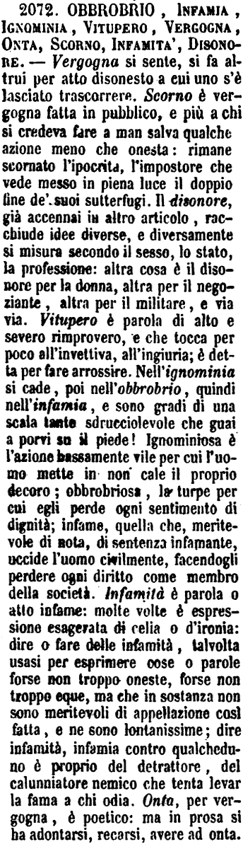 Obbrobrio, Infamia, Ignominia, Vitupero, Vergogna, Onta, Scorno, Infamità, Disonore - Vergogna si sente, si fa altrui per atto disonesto a cui uno s'è lasciato trascorrere. Scorno è vergogna fatta in pubblico, e più a chi si credeva fare a man salva qualche azione meno che onesta: rimane scornato l'ipocrita, l'impostore che vede messo in piena luce il doppio fine de' suoi sutterfugi. Il disonore, già accennai in altro articolo, racchiude idee diverse, e diversamente si misura secondo il sesso, lo stato, la professione: altra cosa è il disonore per la donna, altra per il negoziante, altra per il militare, e via via. Vitupero è parola di alto e severo rimprovero, e che tocca per poco all'invettiva, all'ingiuria; è detta per fare arrossire. Nell'ignominia si cade, poi nell'obbrobrio, quindi nell'infamia , e sono gradi di una scala tanto sdrucciolevole che guai a porvi su il piede! Ignominiosa è l'azione bassamente vile per cui l'uomo mette in non cale il proprio decoro; obbrobriosa, la turpe per cui egli perde ogni sentimento di dignità; infame, quella che, meritevole di nota, di sentenza infamante, uccide l'uomo civilmente, facendogli perdere ogni diritto come membro della società. Infamità è parola o atto infame: molte volte è espressione esagerata di celia o d'ironia: dire o fare delle infamità, talvolta usasi per esprimere cose o parole forse non troppo oneste, forse non troppo eque, ma che in sostanza non sono meritevoli di appellazione così fatta, e ne sono lontanissime; dire infamità, infamia contro qualcheduno è proprio del detrattore, del calunniatore nemico che tenta levar la fama a chi odia. Onta, per vergogna, è poetico: ma in prosa si ha adontarsi, recarsi, avere ad onta. [immagine]
