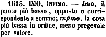 Imo, Infimo - Imo, il punto più basso, opposto o corrispondente a sommo; infimo, la cosa più bassa in ordine, meno pregevole per valore. [immagine]