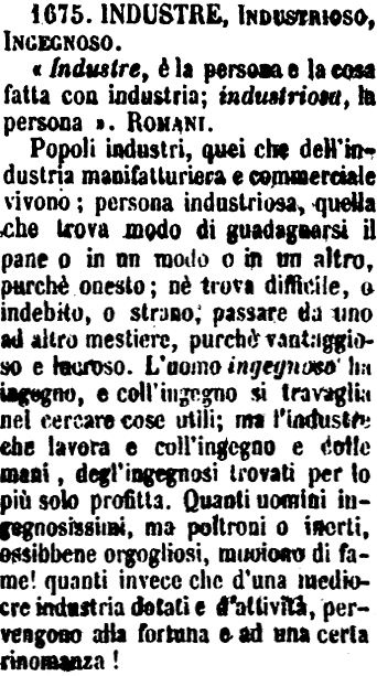 | Industre, Industrioso, Ingegnoso - «Industre, è la persona e la cosa fatta con industria; industriosa, la persona». Romani.