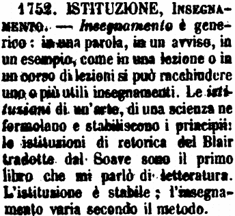 | Istituzione, Insegnamento - Insegnamento è generico: in una parola, in un avviso, in un esempio, come in una lezione o in un corso di lezioni si può racchiudere uno o più utili insegnamenti. Le istituzioni di un'arte, di una scienza ne formolano e stabiliscono i principii: le istituzioni di retorica del Blair tradotte dal Soave sono il primo libro che mi parlò di letteratura. L'istituzione è stabile; l'insegnamento varia secondo il metodo. [immagine] |