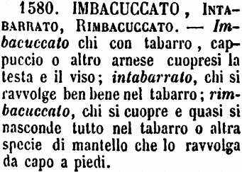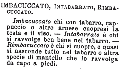 Imbacuccato, Intabarrato, Rimbacuccato - Imbaccuccato chi con tabarro, cappuccio o altro arnese cuopresi la testa e il viso; intabarrato, chi si ravvolge ben bene nel tabarro; rimbacuccato, chi si cuopre e quasi si nasconde tutto nel tabarro o altra specie di mantello che lo ravvolga da capo a piedi. [immagine]