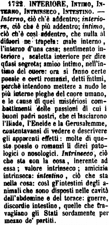 | Interiore, Intimo, Interno, Intrinseco, Intestino - Interno, ciò ch'è addentro; interiore, ciò che è più addentro; intimo, ciò ch'è così addentro, che nulla al difuori ne trapela: male interno, l'interno d'una casa; sentimento interiore, scaletta interiore per dire quasi segreta; amico intimo, nell'intimo del cuore: ora si fanno certe poesie e certi romanzi, detti intimi, perchè intendono mettere a nudo le più interne pieghe del cuore umano, e le cause di quei misteriosi combattimenti delle passioni di cui i buoni padri nostri, che ci lasciarono l'Iliade, l'Eneide e la Gerusalemme, contentavansi di vedere e descrivere gli apparenti effetti: molte di queste poesie o romanzi li direi patologici o nosologici. Intrinseco, ciò che sta con la cosa, inerente ad essa; valore intrinseco; amicizia intrinseca: intestino, ciò che sta nella cosa: così gl'intestini degli animali che sono disposti nelle cavità dell'abdomine e del torace: guerre, discordie intestine, quelle che travagliano gli Stati sordamente per mezzo de' partiti. [immagine] |