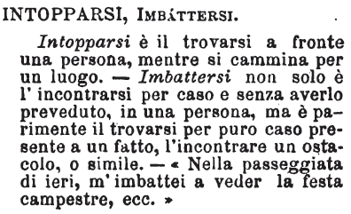 Intopparsi, Imbattersi - Intopparsi è il trovarsi a fronte una persona, mentre si cammina per un luogo. - Imbattersi non solo è l'incontrarsi per caso e senza averlo preveduto, in una persona, ma è parimente il trovarsi per puro caso presente a un fatto, l'incontrare un ostacolo, o simile. - «Nella passeggiata di ieri, m'imbattei a veder la festa campestre, ecc.» [immagine]