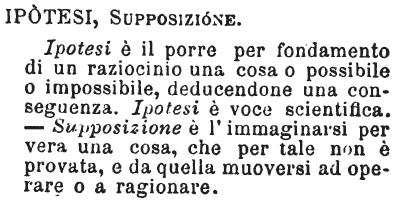 | Ipotesi, Supposizione - Ipotesi è il porre per fondamento di un raziocinio una cosa o possibile o impossibile, deducendone una conseguenza. Ipotesi è voce scientifica. - Supposizione è l'immaginarsi per vera una cosa, che per tale non è provata, e da quella muoversi ad operare o a ragionare. [immagine] |
