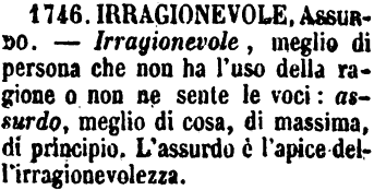 Irragionevole, Assurdo - Irragionevole, meglio di persona che non ha l'uso della ragione o non ne sente le voci: assurdo, meglio di cosa, di massima, di principio. L'assurdo è l'apice dell'irragionevolezza. [immagine]