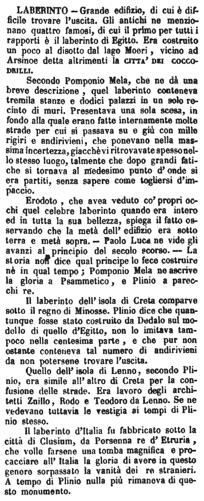 | Laberinto - Grande edifizio, di cui è difficile trovare l'uscita. Gli antichi ne menzionano quattro famosi, di cui il primo per tutti i rapporti è il laberìnto di Egitto. Era costruito un poco al disotto dal lago Moeri, vicino ad Arsinoe detta altrimenti la citta' dei coccodrilli.