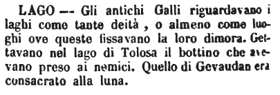 | Lago - Gli antichi Galli riguardavano i laghi come tante deità, o almeno come luoghi ove queste fissavano la loro dimora. Gettavano nel lago di Tolosa il bottino che avevano preso ai nemici. Quello di Gevaudan era consacrato alla luna. [immagine] |