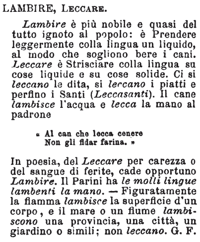Lambire, Leccare - Lambire è più nobile e quasi del tutto ignoto al popolo: è Prendere leggermente colla lingua un liquido, al modo che sogliono bere i cani. Leccare è Strisciare colla lingua su cose liquide e su cose solide. Ci si leccano le dita, si leccano i piatti e perfino i Santi (Leccasanti). Il cane lambisce l'acqua e lecca la mano al padrone