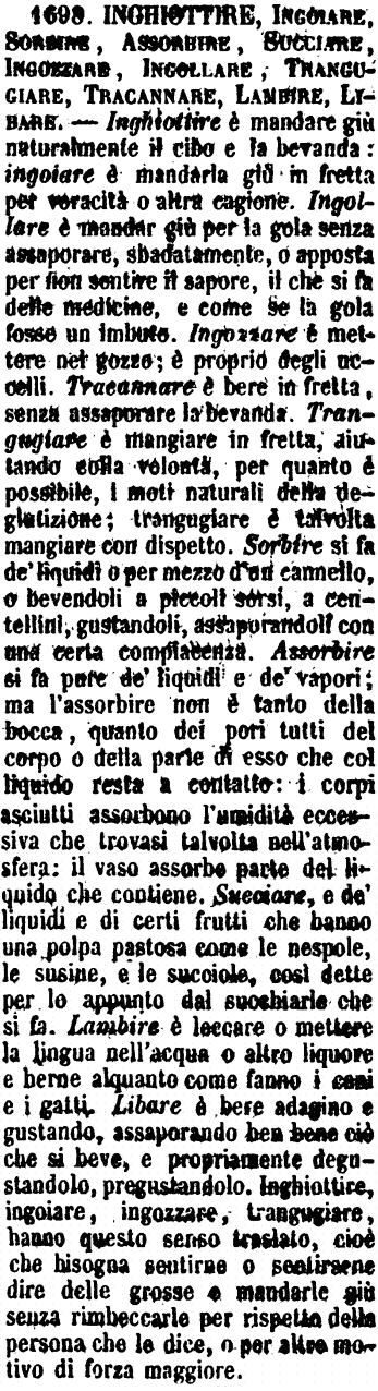 | Inghiottire, Ingoiare, Sorbire, Assorbire, Succiare, Ingozzare, Ingollare, Trangugiare, Tracannare, Lambire, Libare - Inghiottire è mandare giù naturalmente il cibo e la bevanda: ingoiare è mandarla giù in fretta per voracità o altra cagione. Ingollare è mandar giù per la gola senza assaporare, sbadatamente, o apposta per non sentire il sapore, il che si fa delle medicine, e come se la gola fosse un imbuto. Ingozzare è mettere nel gozzo; è proprio degli uccelli. Tracannare è bere in fretta, senza assaporare la bevanda. Trangugiare è mangiare in fretta, aiutando colla volontà, per quanto è possibile, i moti naturali della deglutizione; trangugiare è talvolta mangiare con dispetto. Sorbire si fa de' liquidi o per mezzo d'un cannello, o bevendoli a piccoli sorsi, a centellini, gustandoli, assaporandoli con una certa compiacenza. Assorbire si fa pure de' liquidi e de' vapori; ma l'assorbire non è tanto della bocca, quanto dei pori tutti del corpo o della parte di esso che col liquido resta a contatto: i corpi asciutti assorbono l'umidità eccessiva che trovasi talvolta nell'atmosfera: il vaso assorbe parte del liquido che contiene. Succiare, e de' liquidi e di certi frutti che hanno una polpa pastosa come le nespole, le susine, e le succiole, così dette per lo appunto dal succhiarle che si fa. Lambire è leccare o mettere la lingua nell'acqua o altro liquore e berne alquanto come fanno i cani e i gatti. Libare è bere adagino e gustando, assaporando ben bene ciò che si beve, e propriamente degustandolo, pregustandolo. Inghiottire, ingoiare, ingozzare, trangugiare, hanno questo senso traslato, cioè che bisogna sentirne o sentirsene dire delle grosse e mandarle giù senza rimbeccarle per rispetto della persona che le dice, o per altro motivo di forza maggiore. [immagine] |