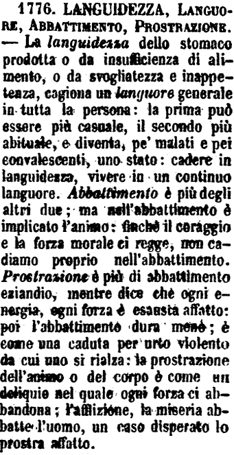 | Languidezza, Languore, Abbattimento, Prostrazione - La languidezza dello stomaco prodotta o da insufficienza di alimento, o da svogliatezza e inappetenza, cagiona un languore generale in tutta la persona: la prima può essere più casuale, il secondo più abituale, e diventa, pe' malati e pei convalescenti, uno stato: cadere in languidezza, vivere in un continuo languore. Abbattimento è più degli altri due; ma nell'abbattimento è implicato l'animo: finchè il coraggio e la forza morale ci regge, non cadiamo proprio nell'abbattimento. Prostrazione è più di abbattimento eziandio, mentre dice che ogni energia, ogni forza è esausta affatto: poi l'abbattimento dura meno; è come una caduta per urto violento da cui uno si rialza: la prostrazione dell'animo o del corpo è come un deliquio nel quale ogni forza ci abbandona; l'afflizione, la miseria abbatte l'uomo, un caso disperato lo prostra affatto. [immagine] |