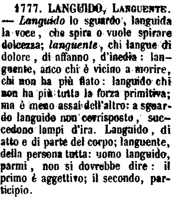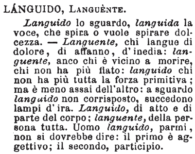 | Languido, Languente - Languido lo sguardo, languida la voce, che spira o vuole spirare dolcezza; languente, chi langue di dolore, di affanno, d'inedia: languente, anco chi è vicino a morire, chi non ha più fiato: languido chi non ha più tutta la forza primitiva; ma è meno assai dell'altro: a sguardo languido non corrisposto, succedono lampi d'ira. Languido, di atto e di parte del corpo; languente, della persona tutta: uomo languido, parmi, non si dovrebbe dire: il primo è aggettivo; il secondo, participio. [immagine] |