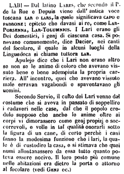 Lari - Dal latino Lares, che secondo il P. de la Rue e Depuis viene dall'antica voce toscana lar o lars, la quale significava capo e padrone; epiteto che davasi ai re, come Lar-Porsenna, Lar-Tolumnius. I Lari erano gli Dei domestici, i genj di ciascuna casa. Si ponevano comunemente dice Dacier, nei canti del focolare, Il quale in alcuni luoghi della Linguadoca si chiama tuttora lar.