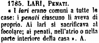 Lari, Penati - «I lari erano comuni a tutte le case: i penati ciascuno li aveva di proprio. Ai lari si sacrificava al focolare; ai penati, nell'atrio o nella parte interiore della casa». A. [immagine]