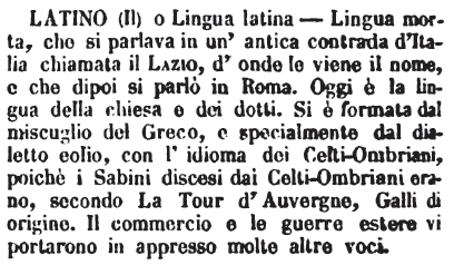 | Latino (Il) o Lingua latina - Lingua morta, che si parlava in un'antica contrada d'Italia chiamata il Lazio, d'onde le viene il nome, e che dipoi si parlò in Roma. Oggi è la lingua della chiesa e dei dotti. Si è formata dal miscuglio del Greco, e specialmente dal dialetto eolio, con l'idioma dei Celti-Ombriani, poichè i Sabini discesi dai Celti-Ombriani erano, secondo La Tour d'Auvergne, Galli di origine. Il commercio e le guerre estere vi portarono in appresso molte altre voci. [immagine] |