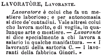 | Lavoratore, Lavorante - Lavoratore è colui che fa un mestiere laborioso; e per antonomasia si dice de' contadini. Vale altresì colui che lavora molto, e di voglia, in qualunque arte o mestiere. - Lavorante si dice specialmente a chi lavora a salario in qualche manifattura. - «I lavoranti della sartoria C. - I lavoranti della fabbrica Ginori.» [immagine] |