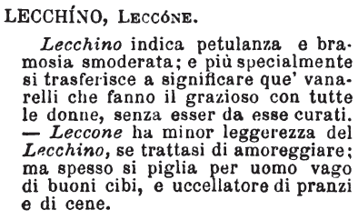 | Lecchino, Leccone - Lecchino indica petulanza e bramosia smoderata; e più specialmente si trasferisce a significare que' vanarelli che fanno il grazioso con tutte le donne, senza esser da esse curati. - Leccone ha minor leggerezza del Lecchino, se trattasi di amoreggiare; ma spesso si piglia per uomo vago di buoni cibi, e uccellatore di pranzi e di cene. [immagine] |