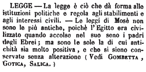 Legge, Diritto - Ella è cosa curiosa che la legge stabilisca il diritto per quanto è inteso dai legislatori nelle diverse epoche, secondo la scienza e l'ingegno, l'esperienza di cui sono dotati; e che poi sulle leggi, sui decreti, statuti o canoni, decisioni e sentenze si studii il diritto: diritto delle genti, diritto civile, diritto canonico per ora; finchè venga un diritto politico o altri rami di diritto, quando vi sia una legislazione abbastanza compita sulle diverse materie da poterneli derivare. Ma il diritto così stabilito e studiato empiricamente, non poteva dirsi il vero diritto teorico, basato sui più sani principii della filosofia del diritto medesimo. Da Grozio però, da Montesquieu, da Filangieri, da Gioia, da Beccaria e da altri più moderni si piantarono i cardini di questa scienza, si seminarono que' principii salutari che andranno di mano in mano fruttificando. La legge però, comunque, determina il diritto; perchè meglio è sempre un lumicino per fioco che sia, che il buio perfetto; il diritto positivo riconosciuto leso o mal inteso dalla legge, serve di norma onde correggerla e renderla migliore, più equa, e a ricondurla nel vero. [immagine]