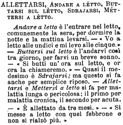 Allettarsi, Andare a letto, Buttarsi sul letto, Sdrajarsi, Mettersi a letto - Andare a letto è l'entrare nel letto, comunemente la sera, per dormire la notte e la mattina levarsi. - «Vo a letto alle undici e mi levo alle cinque.» - Buttarsi sul letto è l'andarvi così tra giorno, per farvi un breve sonno. - «Si butti un'ora sul letto, e or ora la chiameremo.» - Quasi il medesimo è Sdrajarsi; ma questo si fa anche per semplice riposo. - Allettarsi e Mettersi a letto si fa per malattia lunga o pericolosa; il primo per malattia cronica, il secondo per acuta. - «È allettato da tre mesi.» - «Si messe a letto con quel febbrone e non si rialzò più.» [immagine]