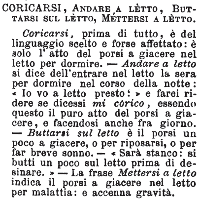 Coricarsi, Andare a letto, Buttarsi sul letto, Mettersi a letto - Coricarsi, prima di tutto, è del linguaggio scelto e forse affettato: è solo l'atto del porsi a giacere nel letto per dormire. - Andare a letto si dice dell'entrare nel letto la sera per dormire nel corso della notte: «Io vo a letto presto;» e farei ridere se dicessi mi còrico, essendo questo il puro atto del porsi a giacere, e facendosi anche fra giorno. - Buttarsi sul letto è il porsi un poco a giacere, o per riposarsi, o per far breve sonno. - «Sarà stanco: si butti un poco sul letto prima di desinare.» - La frase Mettersi a letto indica il porsi a giacere nel letto per malattia: e accenna gravità. [immagine]