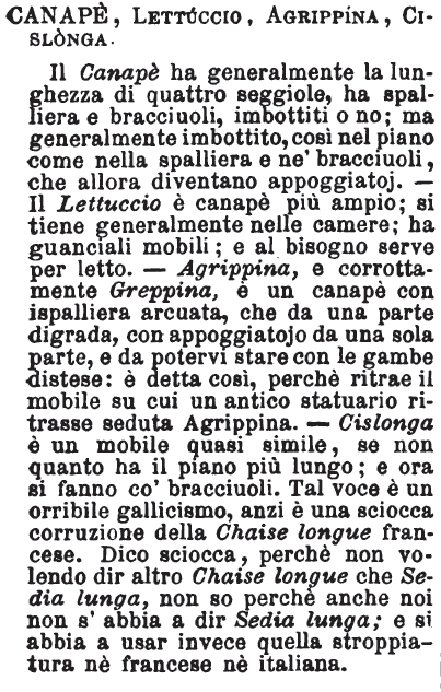 Canapè, Lettuccio, Agrippina, Cislonga - Il Canapè ha generalmente la lunghezza di quattro seggiole, ha spalliera e bracciuoli, imbottiti o no; ma generalmente imbottito, così nel piano come nella spalliera e ne' bracciuoli, che allora diventano appoggiatoj. - Il Lettuccio è canapè più ampio; si tiene generalmente nelle camere; ha guanciali mobili; e al bisogno serve per letto. - Agrippina, e corrottamente Greppina, è un canapè con ispalliera arcuata, che da una parte digrada, con appoggiatojo da una sola parte, e da potervi stare con le gambe distese: è detta così, perchè ritrae il mobile su cui un antico statuario ritrasse seduta Agrippina. - Cislonga è un mobile quasi simile, se non quanto ha il piano più lungo; e ora si fanno co' bracciuoli. Tal voce è un orribile gallicismo, anzi è una sciocca corruzione della Chaise longue francese. Dico sciocca, perchè non volendo dir altro Chaise longue che Sedia lunga, non so perchè anche noi non s'abbia a dir Sedia lunga; e si abbia a usar invece quella stroppiatura nè francese nè italiana. [immagine]