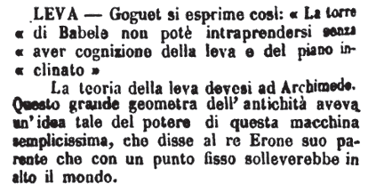 | Leva - Goguet si esprime così: «La torre di Babele non potè intraprendersi senza aver cognizione della leva e del piano inclinato»