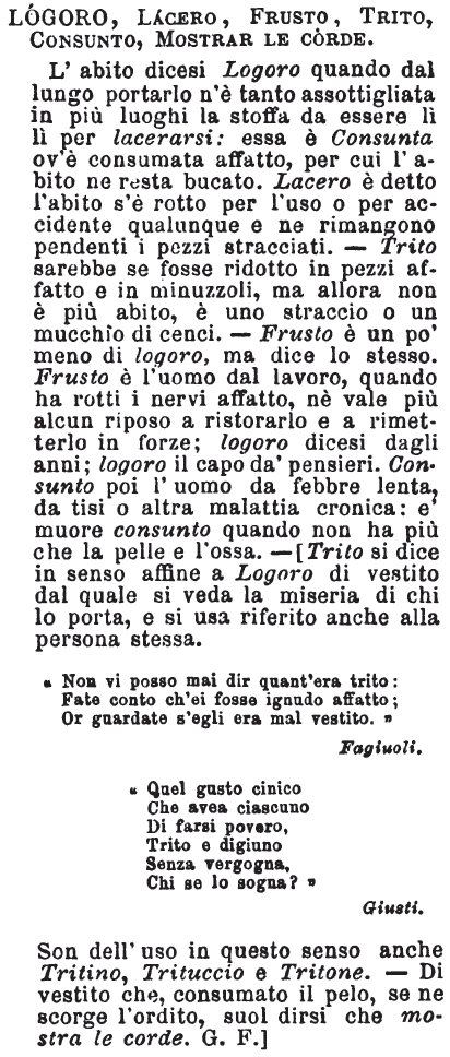 | Logoro, Lacero, Frusto, Trito, Consunto, Mostrar le corde - L'abito dicesi Logoro quando dal lungo portarlo n'è tanto assottigliata in più luoghi la stoffa da essere lì lì per lacerarsi: essa è Consunta ov'è consumata affatto, per cui l'abito ne resta bucato. Lacero è detto l'abito s'è rotto per l'uso o per accidente qualunque e ne rimangono pendenti i pezzi stracciati. - Trito sarebbe se fosse ridotto in pezzi affatto e in minuzzoli, ma allora non è più abito, è uno straccio o un mucchio di cenci. - Frusto è un po' meno di logoro, ma dice lo stesso. Frusto è l'uomo dal lavoro, quando ha rotti i nervi affatto, nè vale più alcun riposo a ristorarlo e a rimetterlo in forze; logoro dicesi dagli anni; logoro il capo da' pensieri. Consunto poi l'uomo da febbre lenta, da tisi o altra malattia cronica: e' muore consunto quando non ha più che pelle e l'ossa. - [Trito si dice in senso affine a Logoro di vestito dal quale si veda la miseria di chi lo porta, e si usa riferito anche alla persona stessa.