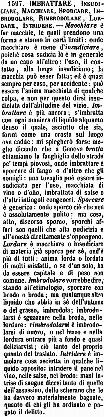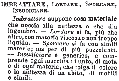 Imbrattare, Insudiciare, Macchiare, Sporcare, Imbrodolare, Rimbrodolare, Lordare, Intridere - Macchiare è far macchie, le quali prendono una forma e stanno in certi limiti: onde macchiare è meno d'insudiciare, poichè cosa sudicia lo è in generale da un capo all'altro: l'uso, il contatto, alla lunga insudiciano; la macchia può esser fatta; ed è quasi sempre per caso, per accidente: può essere l'anima macchiata di qualche colpa, e non per questo dirsi insudiciata dall'abitudine del vizio. Imbrattare è più ancora: s'imbratta con ogni maniera di liquido alquanto denso il quale, asciutto che sia, formi come una crosta sul luogo ove cadde: mi spiegherò forse meglio dicendo che a Genova bratta chiamiamo la fanghiglia delle strade pe' tempi piovosi, onde imbrattare è sporcare di fango o d'altro che gli somigli: una tovaglia può essere insudiciata per l'uso, macchiata di vino o d'olio, imbrattata di salse o d'altri intingoli congeneri. Sporcare è generico: onde sporco ciò che non è assolutamente pulito: ma cosa, atto, discorso sporco, sporchi affari son quelli che alla pudicizia e all'onestà direttamente s'oppongono. Lordare è macchiare o insudiciare di materia già sporca per sè, ond'è più di tutti: anima lorda o lordata di molti misfatti, o se d'un solo, ha da essere capitale e di peso non comune. Imbrodolare vorrebbe dire, stando all'etimologia, sporcare con brodo o broda; ma qualunque altro liquido che abbia in sè dell'untume o del grasso, imbrodola; imbrodolarsi è sguazzare nella broda, nelle lordure: rimbrodolarsi è imbrodolarsi di nuovo, o nel lezzo e nella lordura entrare più a fondo e quasi deliziarvisi; ciò tanto del proprio quanto del traslato. Intridere è immolare cosa asciutta in qualche liquido apposito: intridere il pane nel vino, nelle salse, nel brodo: mani intrise di sangue dicesi tanto di quelle dell'assassino, dello scherano che le ha davvero materialmente bagnate, quanto di chi gli ha ordinato e pagato il delitto. [immagine]