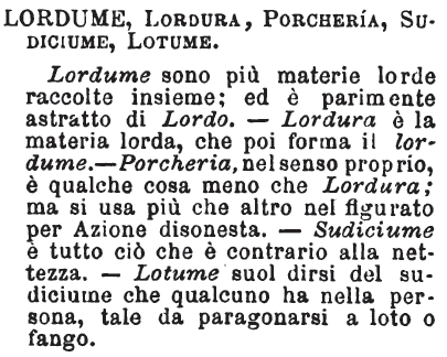 Lordume, Lordura, Porcheria, Sudiciume, Lotume - Lordume sono più materie lorde raccolte insieme; ed è parimente astratto di Lordo. - Lordura è la materia lorda, che poi forma il lordume. - Porcheria, nel senso proprio, è qualche cosa meno che Lordura; ma si usa più che altro nel figurato per Azione disonesta. - Sudiciume è tutto ciò che è contrario alla nettezza. - Lotume suol dirsi del sudiciume che qualcuno ha nella persona, tale da paragonarsi a loto o fango. [immagine]