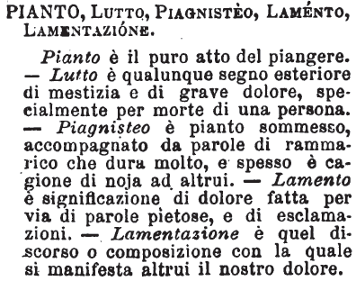 | Pianto, Lutto, Piagnisteo, Lamento, Lamentazione - Pianto è il puro atto del piangere. - Lutto è qualunque segno esteriore di mestizia e di grave dolore, specialmente per morte di una persona. - Piagnisteo è pianto sommesso, accompagnato da parole di rammarico che dura molto, e spesso è cagione di noja ad altrui. - Lamento è significazione di dolore fatta per via di parole pietose, e di esclamazioni. - Lamentazione è quel discorso o composizione con la quale si manifesta altrui il nostro dolore. [immagine] |
