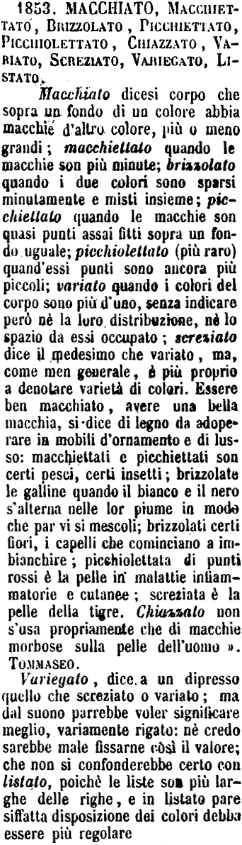 Macchiato, Macchiettato, Brizzolato, Picchiettato, Picchiolettato, Chiazzato, Variato, Screziato, Variegato, Listato