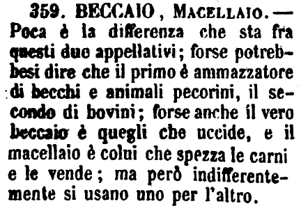 | Beccaio, Macellaio - Poca è la differenza che sta fra questi due appellativi; forse potrebbesi dire che il primo è ammazzatore di becchi e animali pecorini, il secondo di bovini; forse anche il vero beccaio è quegli che uccide, e il macellaio è colui che spezza le carni e le vende; ma però indifferentemente si usano uno per l'altro. [immagine] |