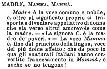 | Madre, Mamma, Mammà - Madre è la voce comune e nobile, e, oltre al significato proprio si trasporta a diventare appellativo di donna che sia verso altrui amorevole come la madre. - «La signora C. è la madre de' poveri.» - La voce Mamma è, fino dal principio della lingua, voce del più dolce affetto; che da poco in qua gli snaturati Italiani hanno convertito francesamente in Mammà; e anche se ne tengono! [immagine] |