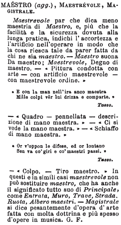| Maestro (agg.), Maestrevole, Magistrale - Maestrevole par che dica meno maestria di Maestro, e, più che la facilità e la sicurezza dovuta alla lunga pratica, indichi l'accortezza e l'artificio nell'operare in modo che la cosa riesca tale da parer fatta da chi ne sia maestro. - Maestro suona Da maestro; Maestrevole, Degno di maestro. - «Pittura condotta con arte - con artificio maestrevole - con maestrevole ordine.»