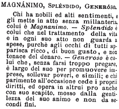 Magnanimo, Splendido, Generoso - Chi ha nobili ed alti sentimenti, e gli mette in atto senza millanteria, colui è Magnanimo. - Splendido è colui che nel trattamento della vita e in ogni suo atto non guarda a spese, purchè agli occhi di tutti apparisca ricco, di buon gusto, e non tenace del denaro. - Generoso è colui che, senza farsi troppo pregare, è largo del suo per promuovere imprese, sollevar poveri, e simili; e chi parimente all'occasione cede i proprii diritti, ed opera in altrui pro anche con suo scapito, mosso dalla gentilezza del suo animo e non da secondi fini. [immagine]