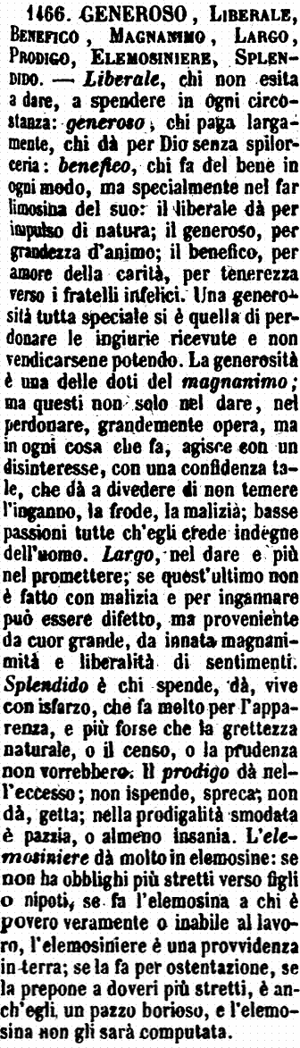 Generoso, Liberale, Benefico, Magnanimo, Largo, Prodigo, Elemosiniere, Splendido - Liberale, chi non esita a dare, a spendere in ogni circostanza: generoso, chi paga largamente, chi dà per Dio senza spilorceria: benefico, chi fa del bene in ogni modo, ma specialmente nel far limosina del suo: il liberale dà per impulso di natura; il generoso, per grandezza d'animo; il benefico, per amore della carità, per tenerezza verso i fratelli infelici. Una generosità tutta speciale si è quella di perdonare le ingiurie ricevute e non vendicarsene potendo. La generosità è una delle doti del magnanimo; ma questi non solo nel dare, nel perdonare, grandemente opera, ma in ogni cosa che fa, agisce con un disinteresse, con una confidenza tale, che dà a divedere di non temere l'inganno, la frode, la malizia; basse passioni tutte ch'egli crede indegne dell'uomo. Largo, nel dare e più nel promettere; se quest'ultimo non è fatto con malizia e per ingannare può essere difetto, ma proveniente da cuor grande, da innata magnanimità e liberalità di sentimenti. Splendido è chi spende, dà, vive con isfarzo, che fa molto per l'apparenza, e più forse che la grettezza naturale, o il censo, o la prudenza non vorrebbero. Il prodigo dà nell'eccesso; non ispende, spreca; non dà, getta; nella prodigalità smodata è pazzia, o almeno insania. L'elemosiniere dà molto in elemosine: se non ha obblighi più stretti verso figli o nipoti, se fa l'elemosina a chi è povero veramente o inabile al lavoro, l'elemosiniere è una provvidenza in terra; se la fa per ostentazione, se la prepone a doveri più stretti, è anch'egli un pazzo borioso, e l'elemosina non gli sarà computata. [immagine]