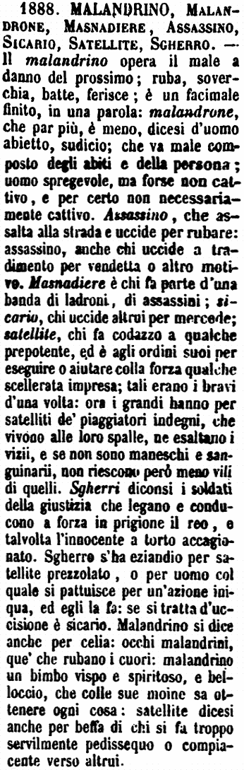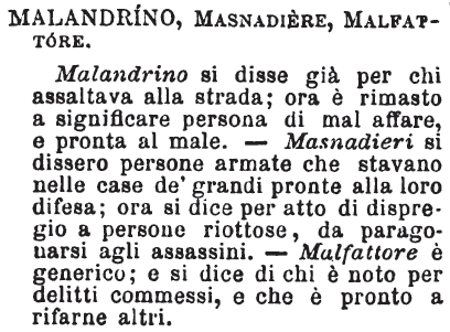 Malandrino, Masnadiere, Malfattore - Malandrino si disse già per chi assaltava alla strada; ora è rimasto a significare persona di mal affare, e pronta al male. - Masnadieri si dissero persone armate che stavano nelle case de' grandi pronte alla loro difesa; ora si dice per atto di dispregio a persone riottose, da paragonarsi agli assassini. - Malfattore è generico; e si dice di chi è noto per delitti commessi, e che è pronto a rifarne altri. [immagine]