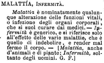 Malattia, Infermità - Malattia è nominatamente qualunque alterazione delle funzioni vitali, o infezione degli organi corporali, che si suol curare dai medici. - Infermità è generico, e si riferisce solo all'effetto delle varie malattie, che è quello di indebolire, e render mal fermo il corpo. - [Malattia, anche d'animali e di piante; Infermità, soltanto degli uomini. G.F.] [immagine]