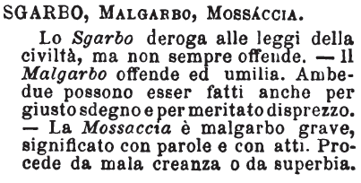 Sgarbo, Malgarbo, Mossaccia - Lo Sgarbo deroga alle leggi della civiltà, ma non sempre offende. - Il Malgarbo offende ed umilia. Ambedue possono esser fatti anche per giusto sdegno e per meritato disprezzo. - La Mossaccia è malgarbo grave, significato con parole e con atti. Procede da mala creanza o da superbia. [immagine]