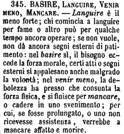 Basire, Languire, Venir meno, Mancare - Languire è il meno forte; chi comincia a languire per fame o altro può per qualche tempo ancora operare; se non vuole, non dà ancora segni esterni di patimento: nel basire sì, il bisogno eccede la forza morale, certi atti o segni esterni si appalesano anche malgrado la volontà; nel venir meno, la debolezza ha presso che consunta la forza fisica, e si finisce per mancare, o cadere in uno svenimento; per cui, se fosse prolungato, o uno non ricevesse assistenza, verrebbe a mancare affatto e morire. [immagine]