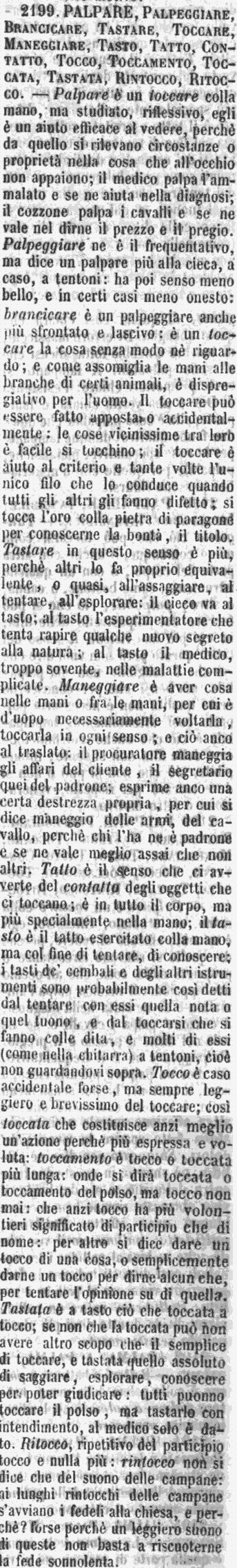 Palpare, Palpeggiare, Brancicare, Tastare, Toccare, Maneggiare, Tasto, Tatto, Contatto, Tocco, Toccamento, Toccata, Tastata, Rintocco, Ritocco - Palpare è un toccare colla mano, ma studiato, riflessivo, egli è un aiuto efficace al vedere, perchè da quello si rilevano circostanze o proprietà nella cosa che all'occhio non appaiono; il medico palpa l'ammalato e se ne aiuta nella diagnosi; il cozzone palpa i cavalli e se ne vale nel dire il prezzo e il pregio. Palpeggiare ne è il frequentativo, ma dice un palpare più alla cieca, a caso, a tentoni: ha poi senso meno bello, e in certi casi meno onesto: brancicare è un palpeggiare anche più sfrontato e lascivo: è un toccare la cosa senza modo nè riguardo; e come assomiglia le mani alle branche di certi animali, è dispregiativo per l'uomo. Il toccare può essere fatto apposta o accidentalmente: le cose vicinissime tra loro è facile si tocchino; il toccare è aiuto al criterio e tante volte l'unico filo che lo conduce quando tutti gli altri gli fanno difetto; si tocca l'oro colla pietra di paragone per conoscerne la bontà, il titolo. Tastare in questo senso è più, perchè altri lo fa proprio equivalente, o quasi, all'assaggiare, al tentare, all'esplorare: il cieco va al tasto; al tasto l'esperimentatore che tenta rapire qualche nuovo segreto alla natura; al tasto il medico, troppo sovente, nelle malattie complicate. Maneggiare è aver cosa nelle mani o fra le mani, per cui è d'uopo necessariamente voltarla, toccarla in ogni senso; e ciò anco al traslato: il procuratore maneggia gli affari del cliente, il segretario quei del padrone; esprime anco una certa destrezza propria, per cui si dice maneggio delle armi, dal cavallo, perchè chi l'ha ne è padrone e se ne vale meglio assai che non altri. Tatto è il senso che ci avverte del contatto degli oggetti che ci toccano; è in tutto il corpo, ma più specialmente nella mano; il tasto è il tatto esercitato colla mano, ma col fine di tentare, di conoscere; i tasti de' cembali e degli altri istrumenti sono probabilmente così detti dal tentare con essi quella nota o quel tuono, e dal toccarsi che si fanno colle dita, e molti di essi (come nella chitarra) a tentoni, cioè non guardandovi sopra. Tocco è caso accidentale forse, ma sempre leggiero e brevissimo del toccare; così toccata che costituisce anzi meglio un'azione perchè più espressa e voluta: toccamento è tocco o toccata più lunga: onde si dirà toccata o toccamento del polso, ma tocco non mai: che anzi tocco ha più volontieri significato di participio che di nome: per altro si dice dare un tocco di una cosa, o semplicemente darne un tocco per dirne alcun che, per tentare l'opinione su di quella. Tastata e a tasto ciò che toccata a tocco; se non che la toccata può non avere altro scopo che il semplice di toccare, e tastata quello assoluto di saggiare, esplorare, conoscere per poter giudicare: tutti puonno toccare il polso, ma tastarlo con intendimento, al medico solo è dato. Ritocco, ripetitivo del participio tocco e nulla più: rintocco non si dice che del suono delle campane: ai lunghi rintocchi delle campane s'avviano i fedeli alla chiesa, e perchè? forse perchè un leggiero suono di queste non basta a riscuoterne la fede sonnolenta. [immagine]