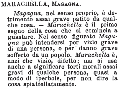Marachella, Magagna - Magagna, nel senso proprio, è detrimento assai grave patito da qualche cosa. - Marachella è il primo segno della cosa che si comincia a guastare. Nel senso figurato Magagna può intendersi per vizio grave di una persona, o per danno grave sofferto da un popolo. Marachella è, anzi che vizio, difetto; ma si usa anche a significare torti morali assai gravi di qualche persona, quasi a modo di iperbole, per non dire la cosa spiattellatamente. [immagine]