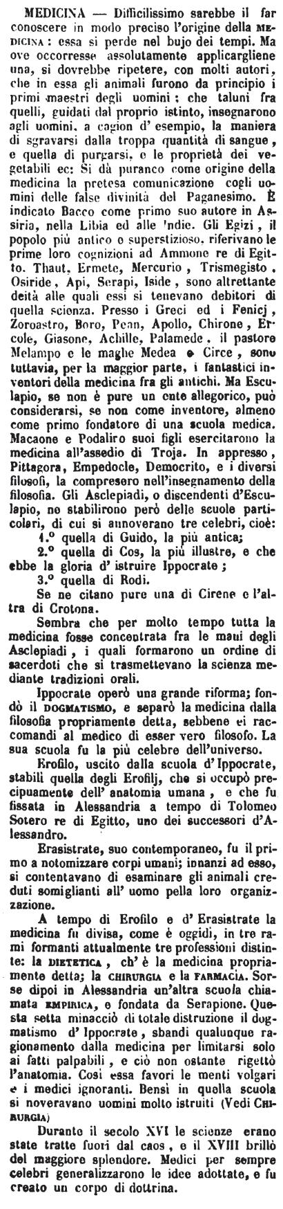 | Medicina - Difficilissimo sarebbe il far conoscere in modo preciso l'origine della medicina: essa si perde nel bujo dei tempi. Ma ove occorresse assolutamente applicargliene una, si dovrebbe ripetere, con molti autori, che in essa gli animali furono da principio i primi maestri degli uomini; che taluni fra quelli, guidati dal proprio istinto, insegnarono agli uomini, a cagion d’esempio, la maniera di sgravarsi dalla troppa quantità di sangue, e quella di purgarsi, e le proprietà dei vegetabili ec: Si dà puranco come origine della medicina la pretesa comunicazione cogli uomini delle false divinità del Paganesimo. È indicato Bacco come primo suo autore in Assiria, nella Libia ed alle Indie. Gli Egizi, il popolo più antico e superstizioso, riferivano le prime loro cognizioni ad Ammone re di Egitto. Thaut, Ermete, Mercurio, Trismegisto, Osiride, Api, Serapi, Iside, sono altrettante deità alle quali essi si tenevano debitori di quella scienza. Presso i Greci ed i Fenicj, Zoroastro, Boro, Pean, Apollo, Chirone, Ercole, Giasone, Achille, Palamede, il pastore Melampo e le maghe Medea e Circe, sono tuttavia, per la maggior parte, i fantastici inventori della medicina fra gli antichi. Ma Esculapio, se non è pure un ente allegorico, può considerarsi, se non come inventore, almeno come primo fondatore di una scuola medica. Macaone e Podaliro suoi figli esercitarono la medicina all'assedio di Troja. In appresso, Pittagora, Empedocle, Democrito, e i diversi filosofi, la compresero nell'insegnamento della filosofia. Gli Asclepiadi, o discendenti d’Esculapio, ne stabilirono però delle scuole particolari, di cui si annoverano tre celebri, cioè: