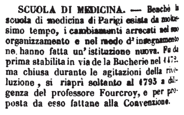 | Scuola di medicina - Benché la scuola di medicina di Parigi esista da moltissimo tempo, i cambiamenti arrecati nel suo organizzamento e nel modo d'insegnamento ne hanno fatta un'istituzione nuova. Fu da prima stabilita in via de la Bucherie nel 1472 ma chiusa durante le agitazioni della rivoluzione, si riaprì soltanto al 1793 a diligenza del professore Fourcroy, e per proposta da esso fattane alla Convenzione. [immagine] |