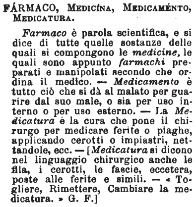 | Farmaco, Medicina, Medicamento, Medicatura - Farmaco è parola scientifica, e si dice di tutte quelle sostanze delle quali si compongono le medicine, le quali sono appunto farmachi preparati e manipolati secondo che ordina il medico. - Medicamento è tutto ciò che si dà al malato per guarire dal suo male, o sia per uso interno o per uso esterno. - La Medicatura è la cura che pone il chirurgo per medicare ferite o piaghe, applicando cerotti o impiastri, nettandole, ecc. - [Medicatura si dicono nel linguaggio chirurgico anche le fila, i cerotti, le fascie, eccetera, poste alle ferite e simili. - «Togliere, Rimettere, Cambiare la medicatura.» G.F.] [immagine] |