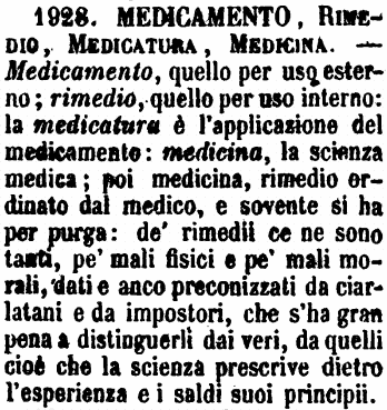 | Medicamento, Rimedio, Medicatura, Medicina - Medicamento, quello per uso esterno; rimedio, quello per uso interno: la medicatura è l'applicazione del medicamento: medicina, la scienza medica; poi medicina, rimedio ordinato dal medico, e sovente si ha per purga: de' rimedii ce ne sono tanti, pe' mali fisici e pe' mali morali, dati e anco preconizzati da ciarlatani e da impostori, che s'ha gran pena a distinguerli dai veri, da quelli cioè che la scienza prescrive dietro l'esperienza e i saldi suoi principii. [immagine] |