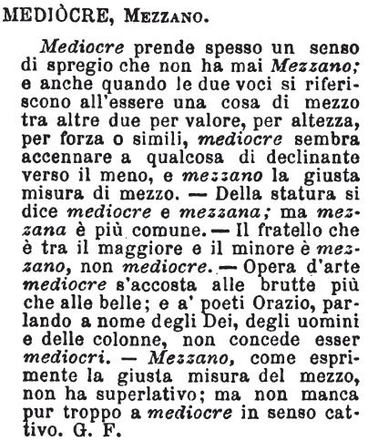 Mediocre, Mezzano - Mediocre prende spesso un senso di spregio che non ha mai Mezzano; e anche quando le due voci si riferiscono all'essere una cosa di mezzo tra altre due per valore, per altezza, per forza o simili, mediocre sembra accennare a qualcosa di declinante verso il meno, e mezzano la giusta misura di mezzo. - Della statura si dice mediocre e mezzana; ma mezzana è più comune. - Il fratello che è tra il maggiore e il minore è mezzano, non mediocre. - Opera d'arte mediocre s'accosta alle brutte più che alle belle; e a' poeti Orazio, parlando a nome degli Dei, degli uomini e delle colonne, non concede esser mediocri. - Mezzano, come esprimente la giusta misura del mezzo, non ha superlativo; ma non manca pur troppo a mediocre in senso cattivo. G. F. [immagine]