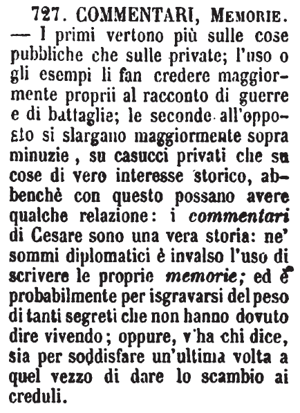 Commentari, Memorie - I primi vertono più sulle cose pubbliche che sulle private; l'uso o gli esempi li fan credere maggiormente proprii al racconto di guerre e di battaglie; le seconde all'opposto si slargano maggiormente sopra minuzie, su casucci privati che su cose di vero interesse storico, abbenchè con questo possano avere qualche relazione: i commentari di Cesare sono una vera storia: ne' sommi diplomatici è invalso l'uso di scrivere le proprie memorie; ed è probabilmente per isgravarsi del peso di tanti segreti che non hanno dovuto dire vivendo; oppure, v'ha chi dice, sia per soddisfare un'ultima volta a quel vezzo di dare lo scambio ai creduli. [immagine]