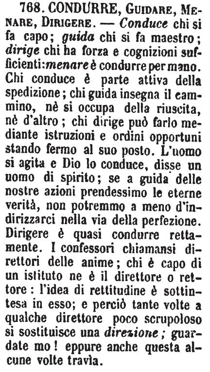 | Condurre, Guidare, Menare, Dirigere, Avviare - Condurre ha in sè l'idea di autorità, o almeno di superiorità, e vale Andar con altrui per cammino, affine di farlo arrivare dove dee andare. - Guidare è accompagnare altrui per insegnarli la via. - Menare è far si che altri, o con l'arte, o con la forza, venga teco in alcun luogo. - «Lo presero e lo menarono in prigione.» - L'accennare altrui per qual verso debba ire per giungere colà dove vuole, quello è Dirigere: e si trasporta a cose morali e di studio. - Avviare è il mostrare altrui quel è la via che dee tenere, e fargli fare in quella i primi passi. Anche questo si trasporta al morale. - «Lo avviò negli studi di logica.» [immagine] |