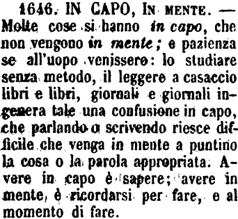 | In capo, In mente - Molte cose si hanno in capo, che non vengono in mente; e pazienza se all'uopo venissero: lo studiare senza metodo, il leggere a casaccio libri e libri, giornali e giornali ingenera tale una confusione in capo, che parlando o scrivendo riesce difficile che venga in mente a puntino la cosa o la parola appropriata. Avere in capo è sapere; avere in mente è ricordarsi per fare, e al momento di fare. [immagine] |