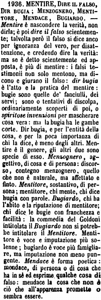 | Mentire, Dire il falso, Dir bugia; Menzognero, Mentitore, Mendace, Bugiardo - Mentire è nascondere la verità, non dirla; è poi dire il falso scientemente; talvolta però il falso si dice anco per ignoranza del vero, per disattenzione, e credendo dire la verità: ma se è detto scientemente ed apposta, è più di mentire: i falsi testimonii non solo mentono, ma dicono e giurano il falso: dir bugia è l'atto e la pratica del mentire: bugie sono quelle de' fanciulli, dei servi; sono o tentativi di discolpa, ordinariamente scoperti di poi, o spiritose invenzioni per mascherare cosa vera: ma la bugia ha le gambe corte. Dir bugia, e per l'entità della cosa, e per la poca importanza di chi la dice, è meno degli altri. Mentire è il genere, gli altri due sono specie di esso. Menzognero, aggettivo, di cosa e di persona: discorso, contegno menzognero, quello che non è naturale, ma affettato e finto. Mentitore, sostantivo, di persona; mentitore, chi mente, chi dice bugia con parole: Bugiardo, chi ha l'abito e la riputazione di mentitore; chi dice le bugie con franchezza e facilità: la commedia del Goldoni intitolata il Bugiardo non si potrebbe intitolare il Mentitore. Mentitore è voce e imputazione più solenne; bugiardo è voce più famigliare, ma imputazione non meno pungente. Mendace è forma poetica: mendace, di persona o di cosa che ha in sé ed esprime qualche cosa di falso: mendace la cosa che non è ciò che all'apparenza promette o sembra essere. [immagine] |